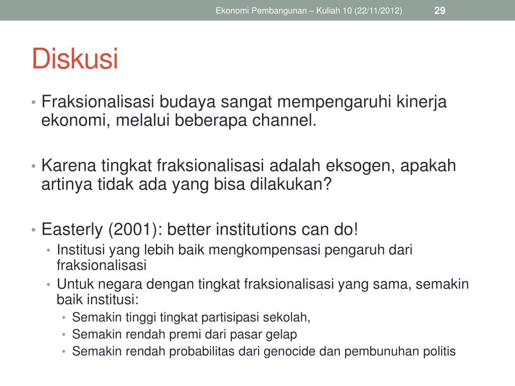 Ekonomi Pembangunan – Kuliah 10 (22/11/2012) Diskusi • Fraksionalisasi budaya sangat mempengaruhi kinerja ekonomi, melalui beberapa channel. • Karena tingkat fraksionalisasi adalah eksogen, apakah artinya tidak ada yang bisa dilakukan? • Easterly (2001): better institutions can do! • Institusi yang lebih baik mengkompensasi pengaruh dari fraksionalisasi • Untuk negara dengan tingkat fraksionalisasi yang sama, semakin baik institusi: • Semakin tinggi tingkat partisipasi sekolah, • Semakin rendah premi dari pasar gelap • Semakin rendah probabilitas dari genocide dan pembunuhan politis