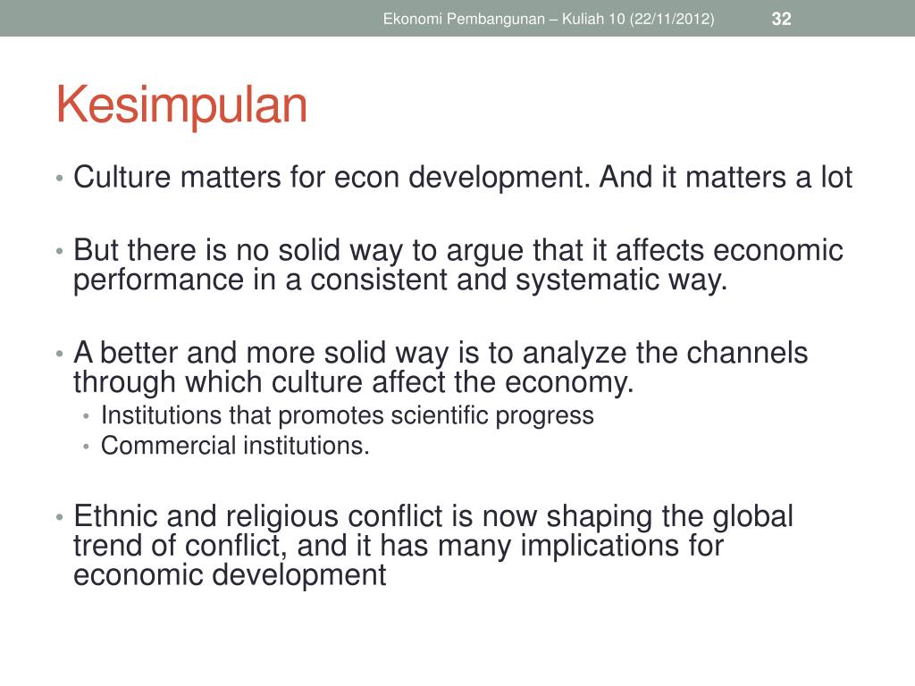 Ekonomi Pembangunan – Kuliah 10 (22/11/2012) Kesimpulan • Culture matters for econ development. And it matters a lot • But there is no solid way to argue that it affects economic performance in a consistent and systematic way. • A better and more solid way is to analyze the channels through which culture affect the economy. • Institutions that promotes scientific progress • Commercial institutions. • Ethnic and religious conflict is now shaping the global trend of conflict, and it has many implications for economic development