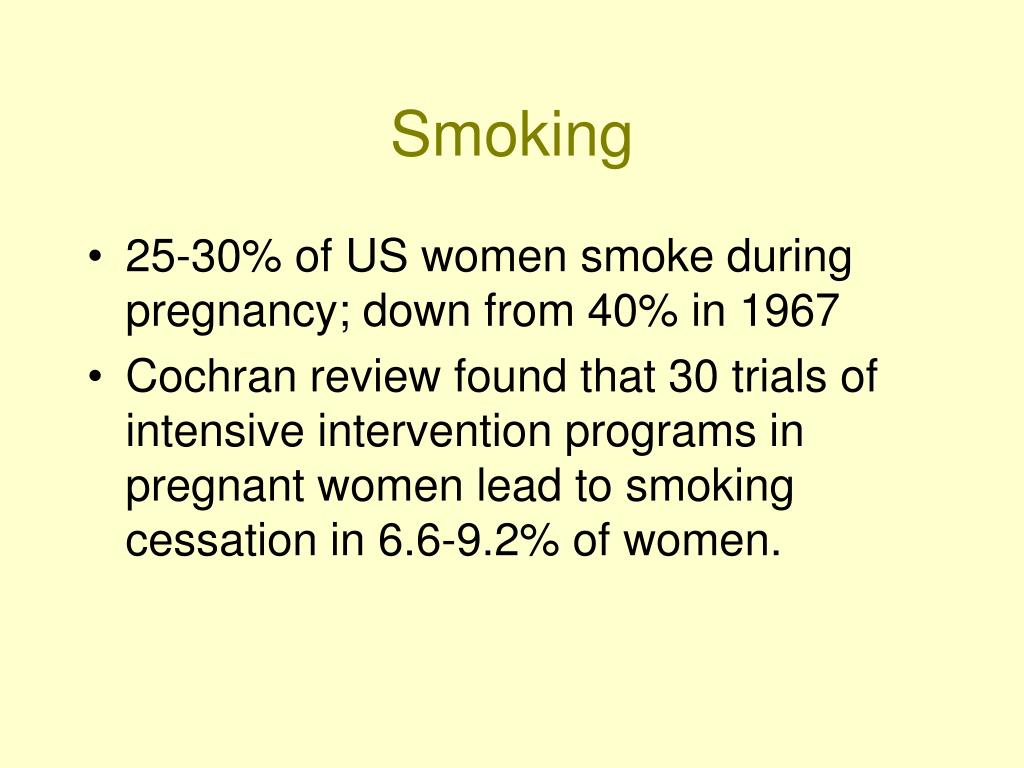 Smoking • 25-30% of US women smoke during pregnancy; down from 40% in 1967 • Cochran review found that 30 trials of intensive intervention programs in pregnant women lead to smoking cessation in 6.6-9.2% of women.
