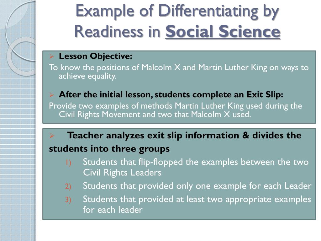 Example of Differentiating by Readiness in Social Science • Lesson Objective: To know the positions of Malcolm X and Martin Luther King on ways to achieve equality. • After the initial lesson, students complete an Exit Slip: Provide two examples of methods Martin Luther King used during the Civil Rights Movement and two that Malcolm X used. • Teacher analyzes exit slip information & divides the • students into three groups • Students that flip-flopped the examples between the two Civil Rights Leaders • Students that provided only one example for each Leader • Students that provided at least two appropriate examples for each leader