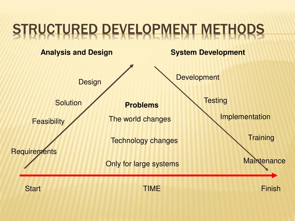 Structured Development Methods Analysis and Design System Development Development Design Testing Solution Problems Implementation The world changes Feasibility Training Technology changes Requirements Maintenance Only for large systems Start TIME Finish