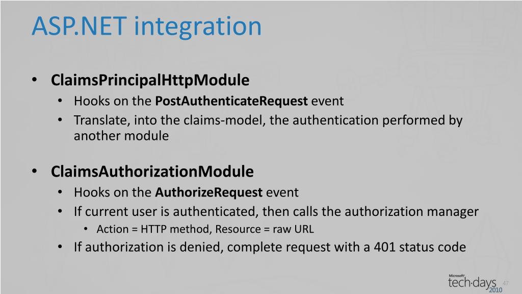 ASP.NET integration • ClaimsPrincipalHttpModule • Hooks on the PostAuthenticateRequestevent • Translate, into the claims-model, the authentication performed by another module • ClaimsAuthorizationModule • Hooks on the AuthorizeRequest event • If current user is authenticated, then calls the authorization manager • Action = HTTP method, Resource = raw URL • If authorization is denied, complete request with a 401 status code