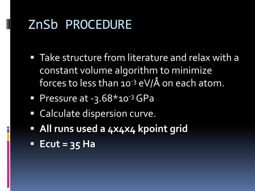 ZnSb PROCEDURE • Take structure from literature and relax with a constant volume algorithm to minimize forces to less than 10-3eV/Å on each atom. • Pressure at -3.68*10-3GPa • Calculate dispersion curve. • All runs used a 4x4x4 kpoint grid • Ecut = 35 Ha