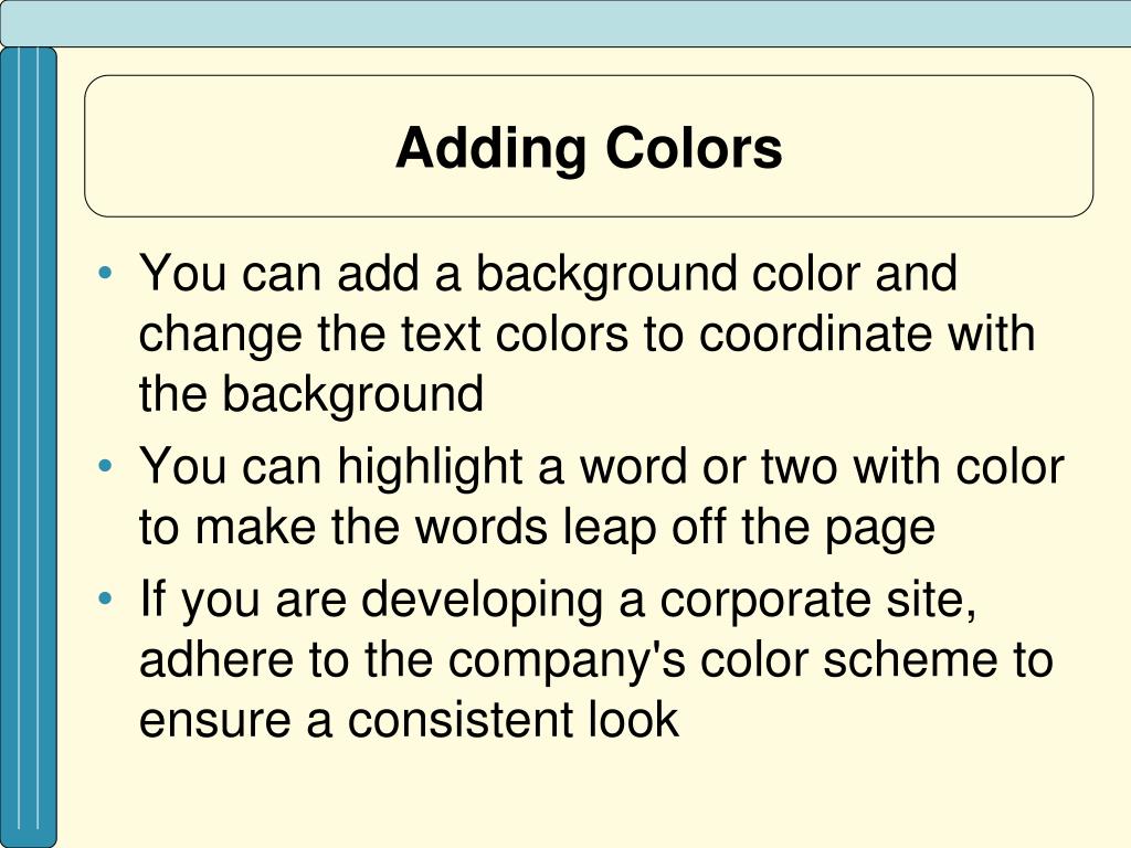 Adding Colors • You can add a background color and change the text colors to coordinate with the background • You can highlight a word or two with color to make the words leap off the page • If you are developing a corporate site, adhere to the company's color scheme to ensure a consistent look