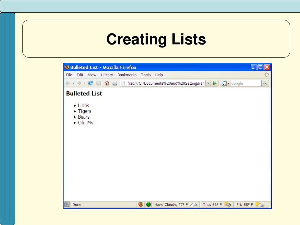 Creating Lists • Lists are a great way to provide information in a structured, easy-to-read format • Lists come in two varieties: • Numbered (ordered) • Bulleted (unordered)
