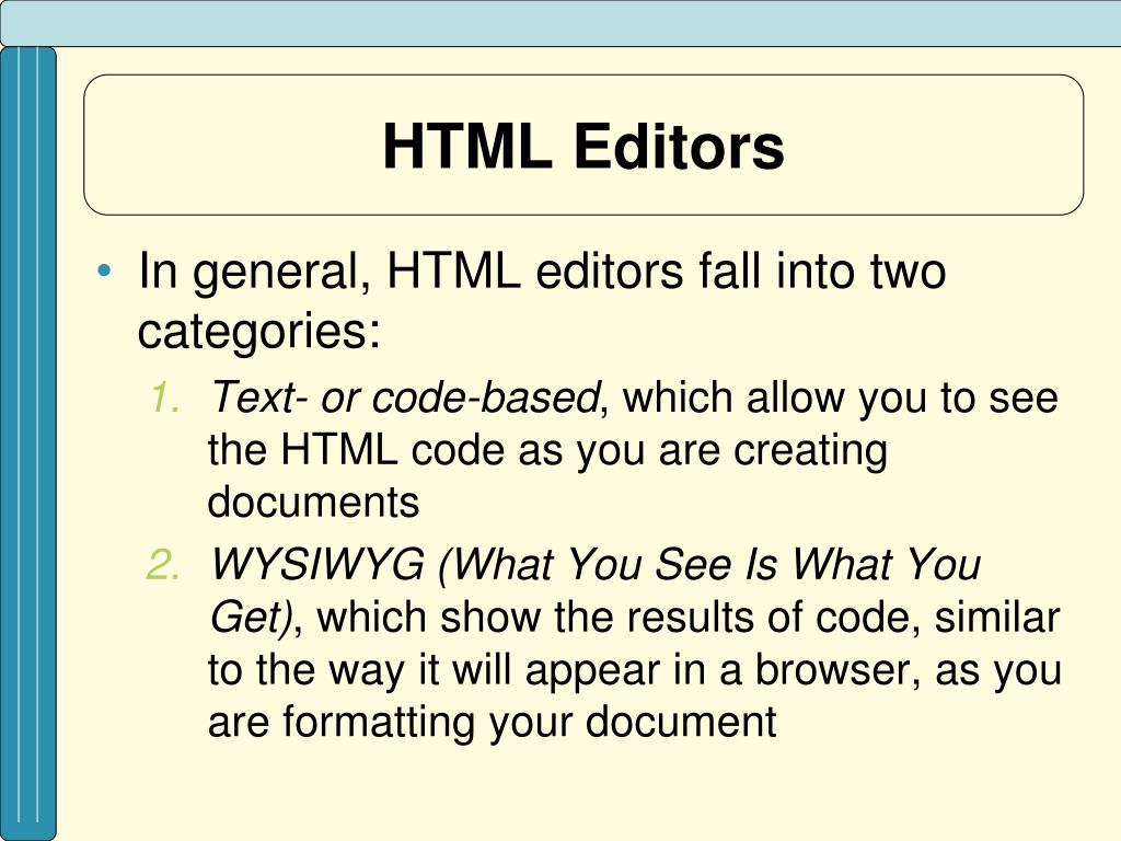 HTML Editors • In general, HTML editors fall into two categories: • Text- or code-based, which allow you to see the HTML code as you are creating documents • WYSIWYG (What You See Is What You Get), which show the results of code, similar to the way it will appear in a browser, as you are formatting your document
