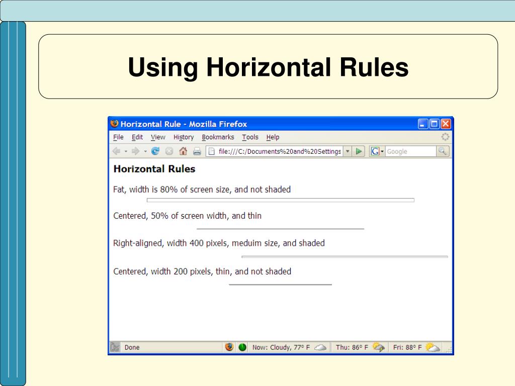 Using Horizontal Rules • Horizontal rules are lines that break up long sections of text, indicate a shift in information, or help improve the overall document design • The <HR> tag is a nonpaired tag; it has no ending tag • To use a horizontal rule, put the <HR> tag where you want the rule to appear: <P>Long passages of text should often be broken into sections with headings and, optionally, horizontal rules.</P> <HR> <H3>A Heading Also Breaks Up Text</H3> <P>A new long passage can continue here.</P>