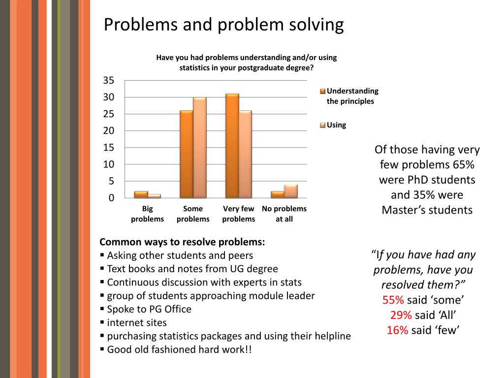 Problems and problem solving Why do problems remain unresolved? “Because I decided that it would be too much effort for too little outcome” “Sometimes other students find it hard to explain and when I’ve gone to a lecturer they find it hard to explain!” “I found that explanations moved too quickly and skipped steps” “It is embarrassing to reveal an inadequacy in statistical knowledge by master’s level” “The continual problem of knowing where it’s appropriate to use statistics”
