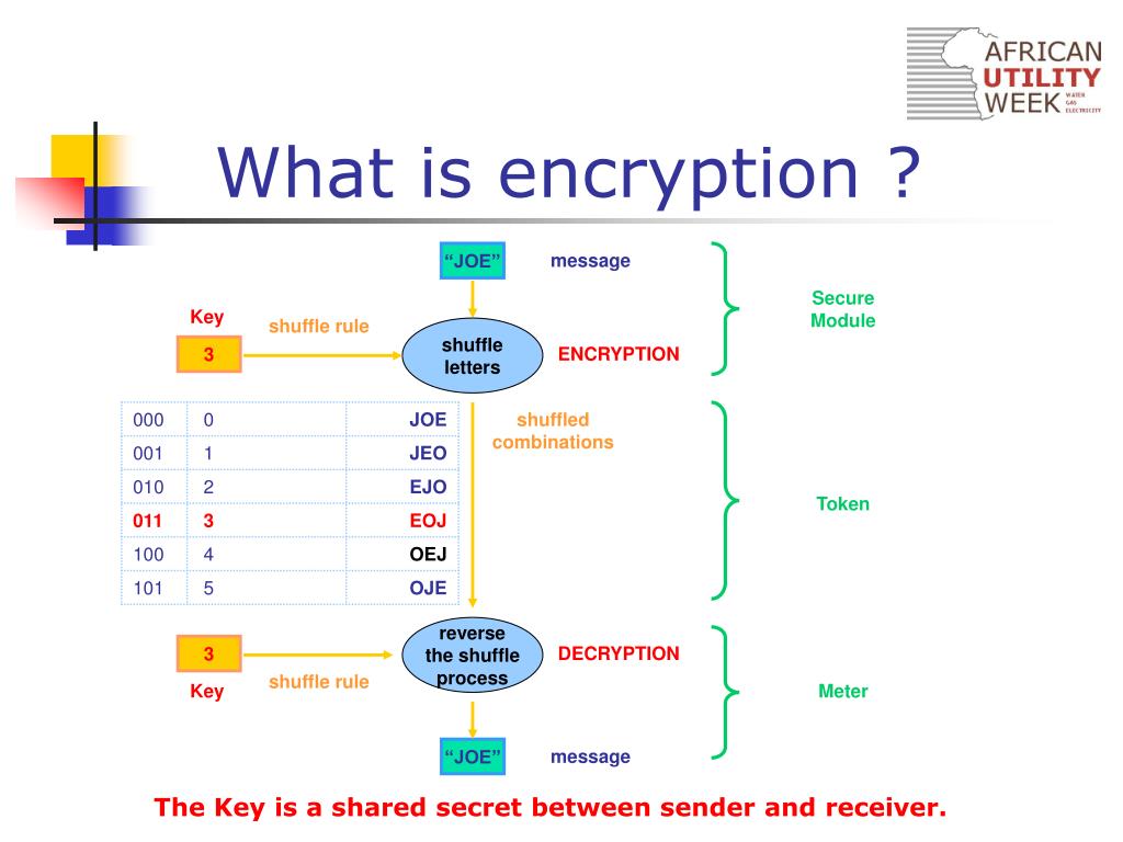 “JOE” message Secure Module Key shuffle rule 3 shuffled combinations Token 3 shuffle rule Key Meter “JOE” message What is encryption ? shuffle letters ENCRYPTION reverse the shuffle process DECRYPTION The Key is a shared secret between sender and receiver.