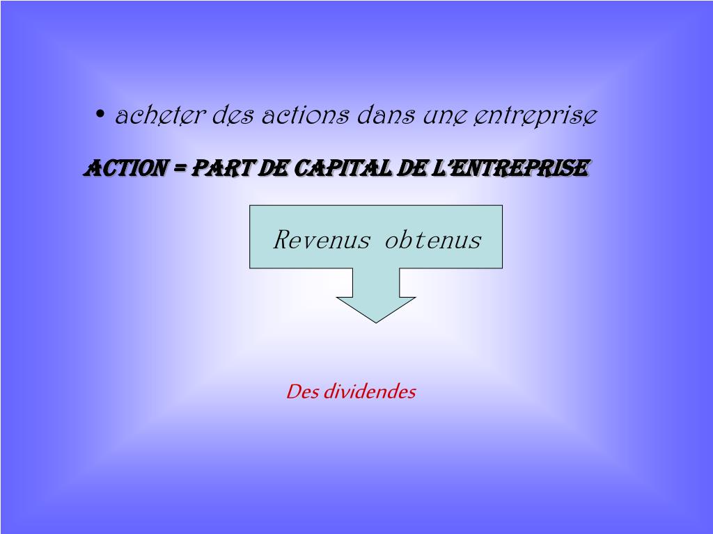 acheter des actions dans une entreprise Action = part de capital de l’entreprise Revenus obtenus Des dividendes