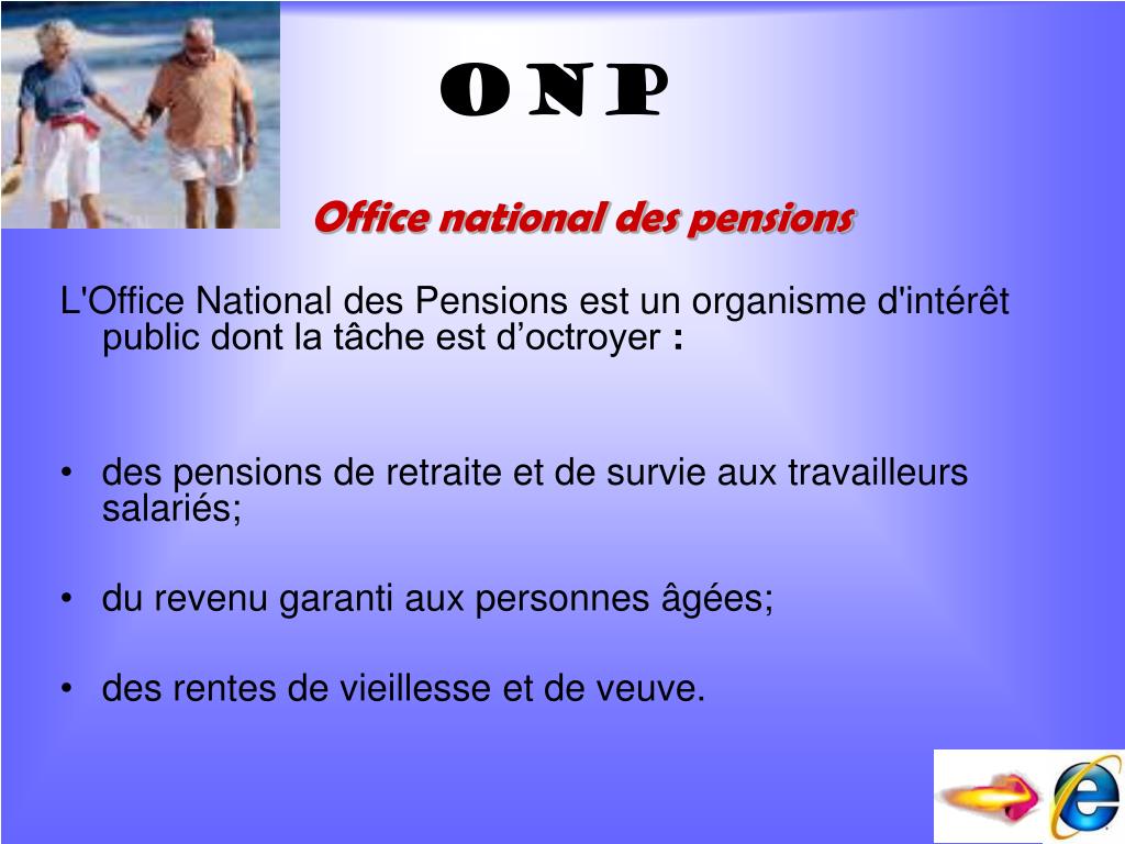 L'Office National des Pensions est un organisme d'intérêt public dont la tâche est d’octroyer : des pensions de retraite et de survie aux travailleurs salariés; du revenu garanti aux personnes âgées; des rentes de vieillesse et de veuve. ONP Office national des pensions