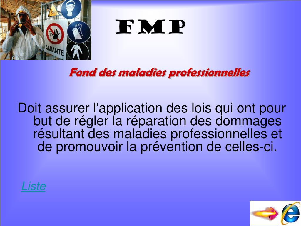 Doit assurer l'application des lois qui ont pour but de régler la réparation des dommages résultant des maladies professionnelles et de promouvoir la prévention de celles-ci. fmP Fond des maladies professionnelles Liste