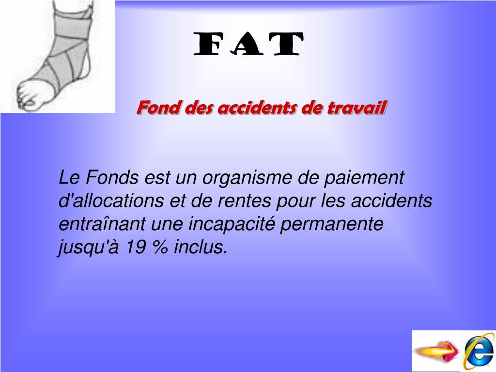 fat Fond des accidents de travail Le Fonds est un organisme de paiement d'allocations et de rentes pour les accidents entraînant une incapacité permanente jusqu'à 19 % inclus.