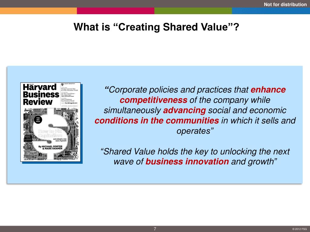 What is “Creating Shared Value”? “Corporate policies and practices that enhance competitivenessof the company while simultaneously advancingsocial and economic conditions in the communities in which it sells and operates” “Shared Value holds the key to unlocking the next wave of business innovation and growth”