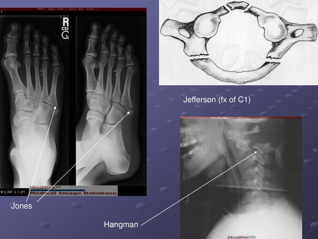 Lisfranc- fx in which one/many metatarsal bones are dislocated from tarsal bones. Jones- fx of the base of the 5th metatarsal of foot Jefferson- fx of Cervical 1 Hangman- fx of Cervical 2 Seat Belt- fx of the body of the Lumbar vertebrae; normally due to trauma Blowout- fx to the floor of the orbit (maxillary and zygoma bones) Tripod- fx to the floor and lateral aspect of the orbit Fractures