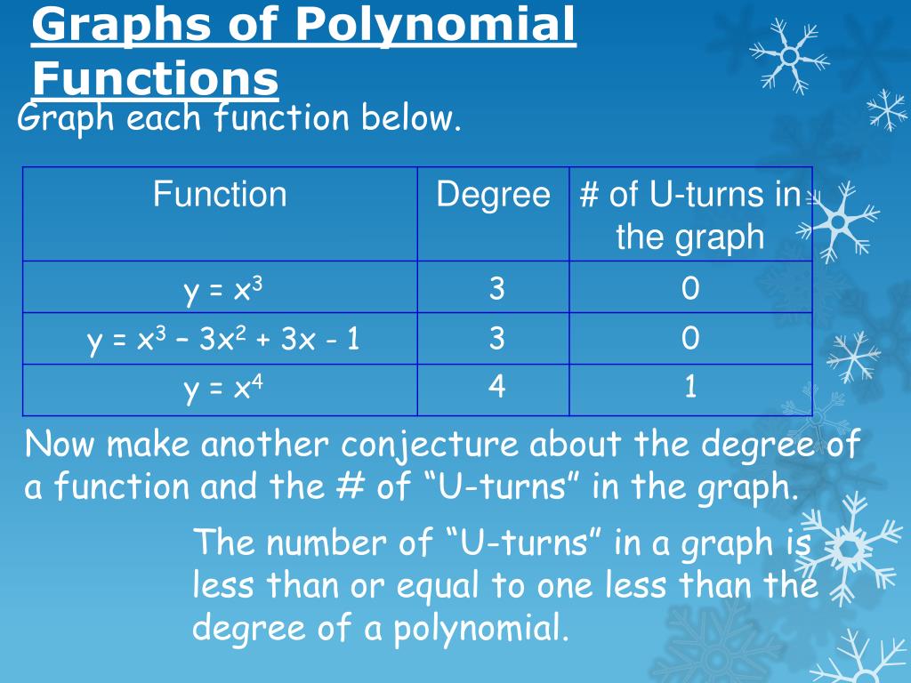 Graphs of Polynomial Functions Graph each function below. 3 0 y = x3 3 0 y = x3 – 3x2 + 3x - 1 4 1 y = x4 Now make another conjecture about the degree of a function and the # of “U-turns” in the graph. The number of “U-turns” in a graph is less than or equal to one less than the degree of a polynomial.