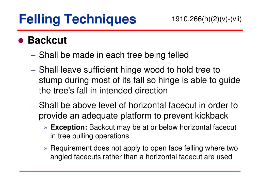 Felling Techniques 1910.266(h)(2)(v)-(vii) • Backcut • Shall be made in each tree being felled • Shall leave sufficient hinge wood to hold tree to stump during most of its fall so hinge is able to guide the tree's fall in intended direction • Shall be above level of horizontal facecut in order to provide an adequate platform to prevent kickback • Exception: Backcut may be at or below horizontal facecut in tree pulling operations • Requirement does not apply to open face felling where two angled facecuts rather than a horizontal facecut are used