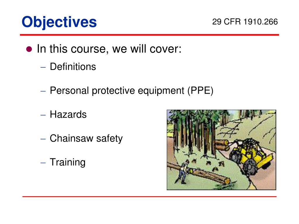 Objectives 29 CFR 1910.266 • In this course, we will cover: • Definitions • Personal protective equipment (PPE) • Hazards • Chainsaw safety • Training