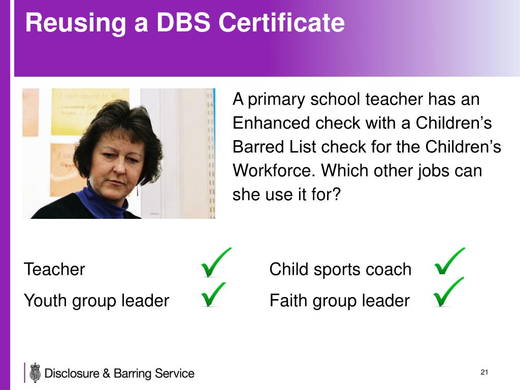 Reusing a DBS Certificate A primary school teacher has an Enhanced check with a Children’s Barred List check for the Children’s Workforce. Which other jobs can she use it for? Teacher Youth group leader Child sports coach Faith group leader