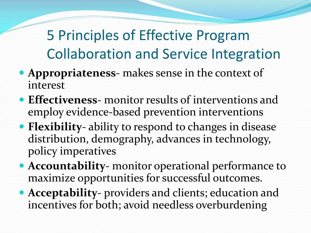 5 Principles of Effective Program Collaboration and Service Integration • Appropriateness- makes sense in the context of interest • Effectiveness- monitor results of interventions and employ evidence-based prevention interventions • Flexibility- ability to respond to changes in disease distribution, demography, advances in technology, policy imperatives • Accountability- monitor operational performance to maximize opportunities for successful outcomes. • Acceptability- providers and clients; education and incentives for both; avoid needless overburdening