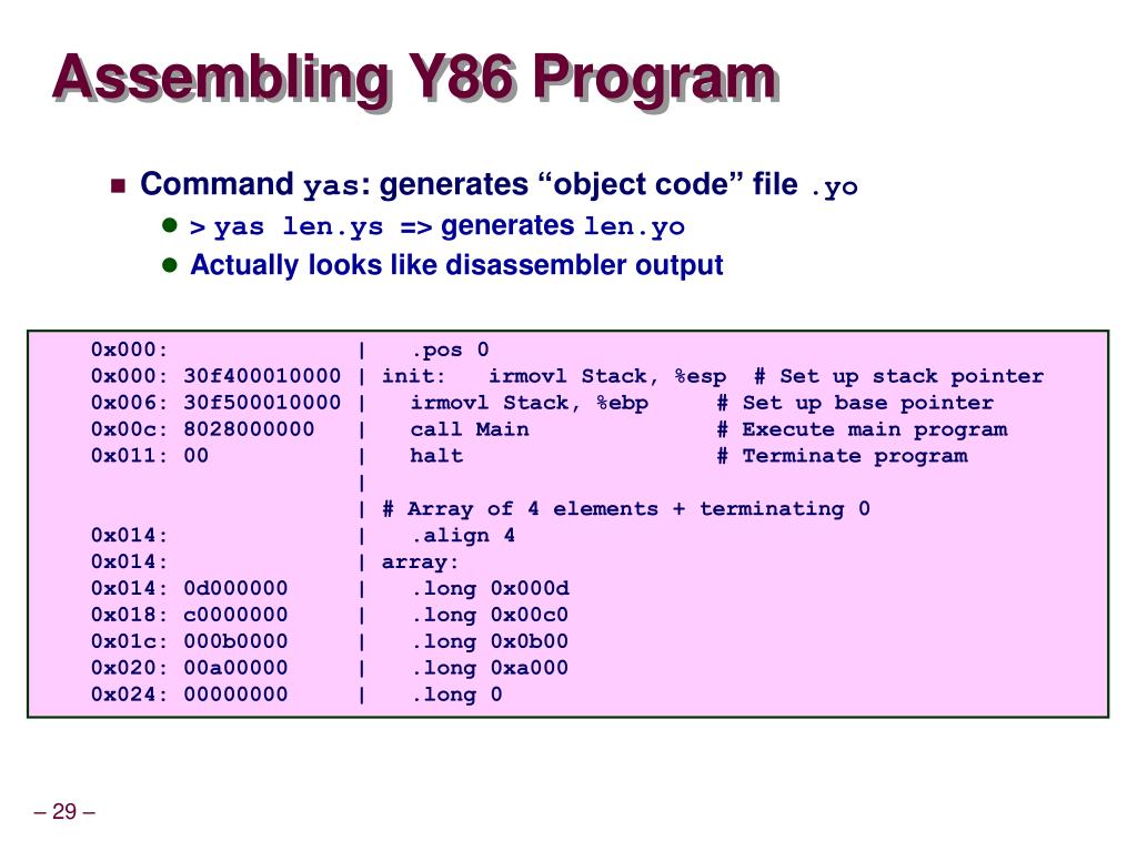 Assembling Y86 Program • Command yas: generates “object code” file .yo • > yaslen.ys => generates len.yo • Actually looks like disassembler output • 0x000: | .pos 0 • 0x000: 30f400010000 | init: irmovl Stack, %esp # Set up stack pointer • 0x006: 30f500010000 | irmovl Stack, %ebp # Set up base pointer • 0x00c: 8028000000 | call Main # Execute main program • 0x011: 00 | halt # Terminate program • | • | # Array of 4 elements + terminating 0 • 0x014: | .align 4 • 0x014: | array: • 0x014: 0d000000 | .long 0x000d • 0x018: c0000000 | .long 0x00c0 • 0x01c: 000b0000 | .long 0x0b00 • 0x020: 00a00000 | .long 0xa000 • 0x024: 00000000 | .long 0