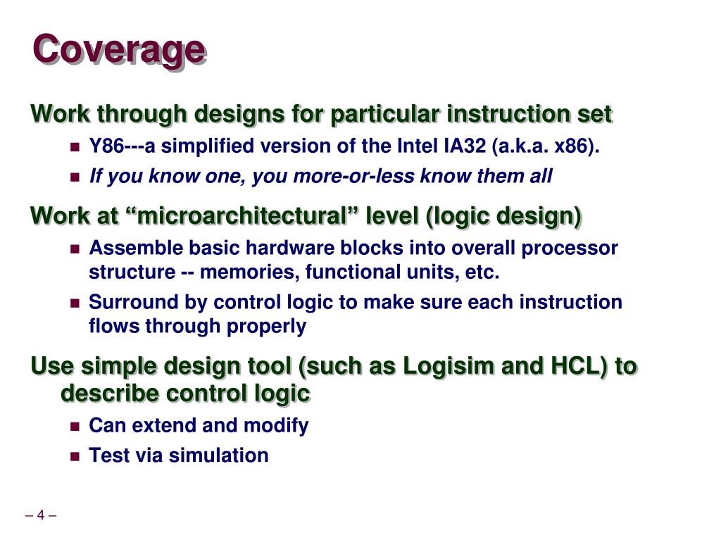 Coverage • Work through designs for particular instruction set • Y86---a simplified version of the Intel IA32 (a.k.a. x86). • If you know one, you more-or-less know them all • Work at “microarchitectural” level (logic design) • Assemble basic hardware blocks into overall processor structure -- memories, functional units, etc. • Surround by control logic to make sure each instruction flows through properly • Use simple design tool (such as Logisim and HCL) to describe control logic • Can extend and modify • Test via simulation