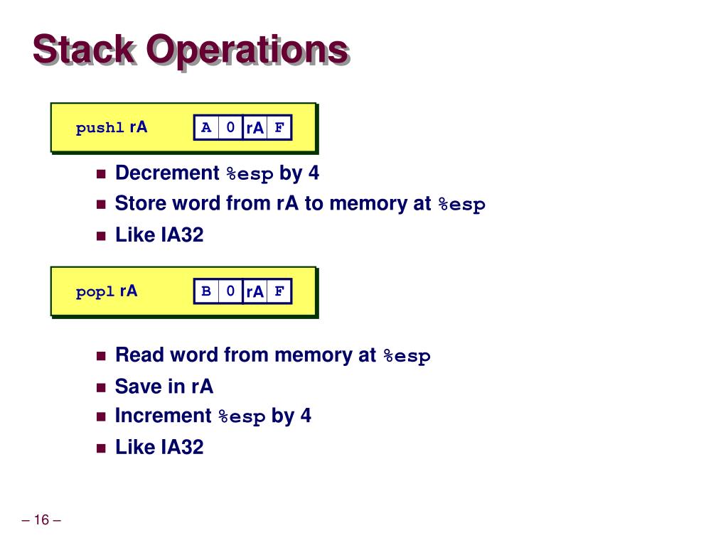 pushl rA popl rA A rA B rA 0 F 0 F Stack Operations • Decrement %esp by 4 • Store word from rA to memory at %esp • Like IA32 • Read word from memory at %esp • Save in rA • Increment %esp by 4 • Like IA32