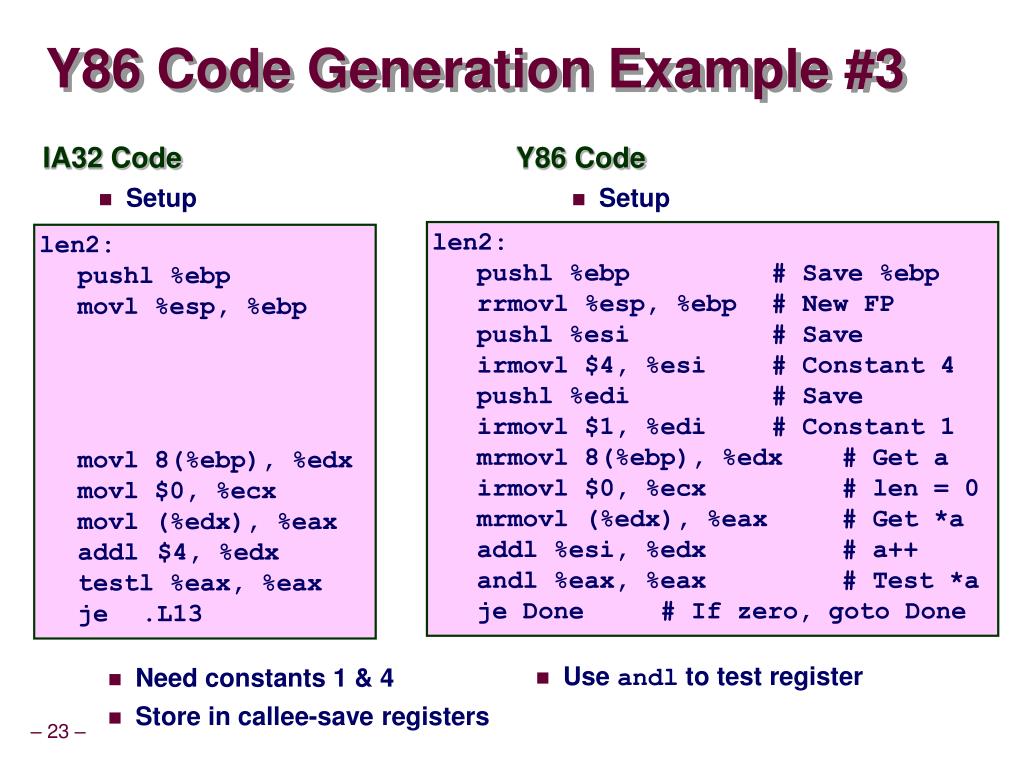 a 5043 6125 3 7395 0 Writing Y86 Code • Try to Use C Compiler as Much as Possible • Write code in C • Compile for IA32 with gcc –O1 –S • Transliterate into Y86 • Coding Example • Find number of elements in null-terminated list int len1(int a[]);