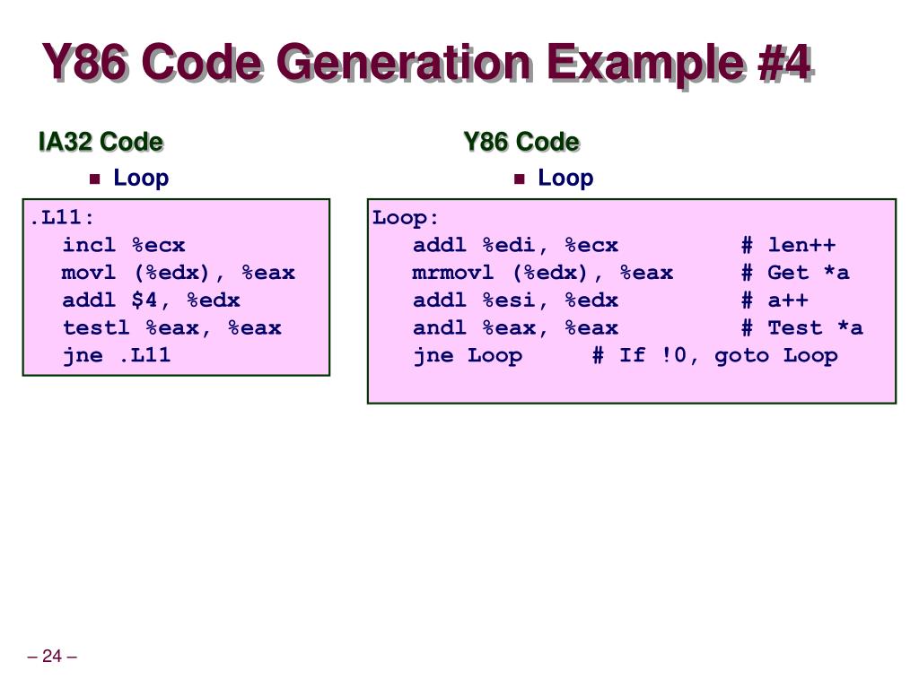IA32 Code Loop Y86 Code Loop Y86 Code Generation Example #4 .L11: incl%ecx movl(%edx), %eax addl$4, %edx testl%eax, %eax jne.L11 Loop: addl %edi, %ecx # len++ mrmovl (%edx), %eax # Get *a addl %esi, %edx # a++ andl %eax, %eax # Test *a jne Loop # If !0, goto Loop