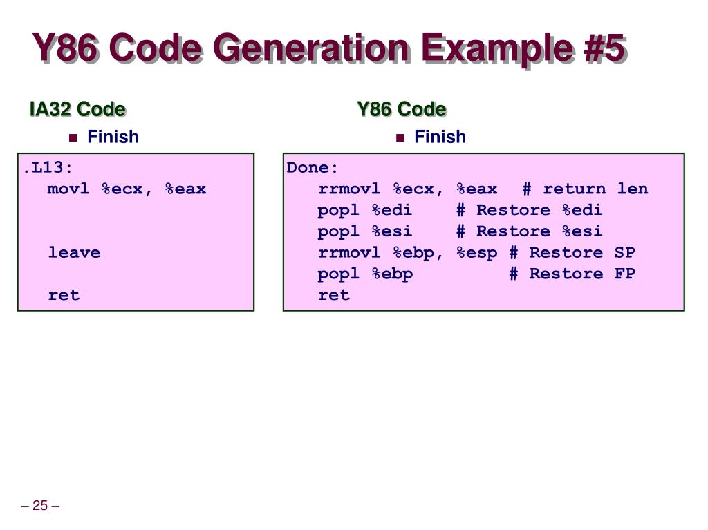 IA32 Code Finish Y86 Code Finish Y86 Code Generation Example #5 .L13: movl%ecx, %eax leave ret Done: rrmovl %ecx, %eax # return len popl %edi # Restore %edi popl %esi # Restore %esi rrmovl %ebp, %esp# Restore SP popl %ebp # Restore FP ret