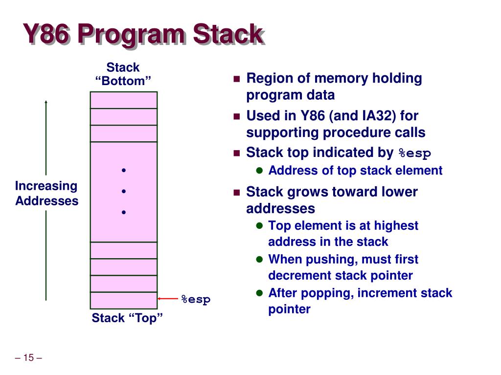 Y86 Program Stack Stack “Bottom” • Region of memory holding program data • Used in Y86 (and IA32) for supporting procedure calls • Stack top indicated by %esp • Address of top stack element • Stack grows toward lower addresses • Top element is at highest address in the stack • When pushing, must first decrement stack pointer • After popping, increment stack pointer • • • Increasing Addresses %esp Stack “Top”