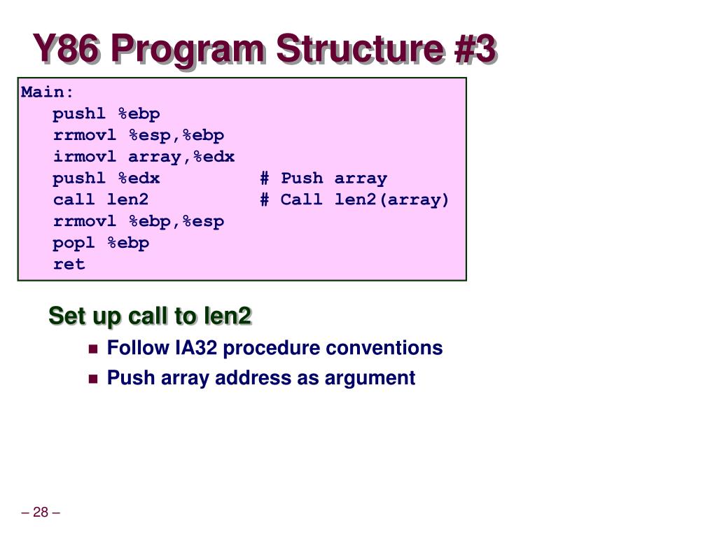 Y86 Program Structure #3 Main: pushl %ebp rrmovl %esp,%ebp irmovlarray,%edx pushl %edx # Push array call len2 # Call len2(array) rrmovl %ebp,%esp popl %ebp ret • Set up call to len2 • Follow IA32 procedure conventions • Push array address as argument