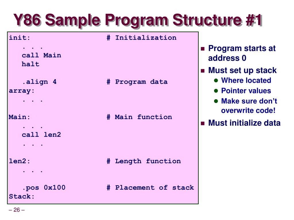 Y86 Sample Program Structure #1 init: # Initialization . . . call Main halt .align 4 # Program data array: . . . Main: # Main function . . . call len2 . . . len2: # Length function . . . .pos 0x100 # Placement of stack Stack: • Program starts at address 0 • Must set up stack • Where located • Pointer values • Make sure don’t overwrite code! • Must initialize data