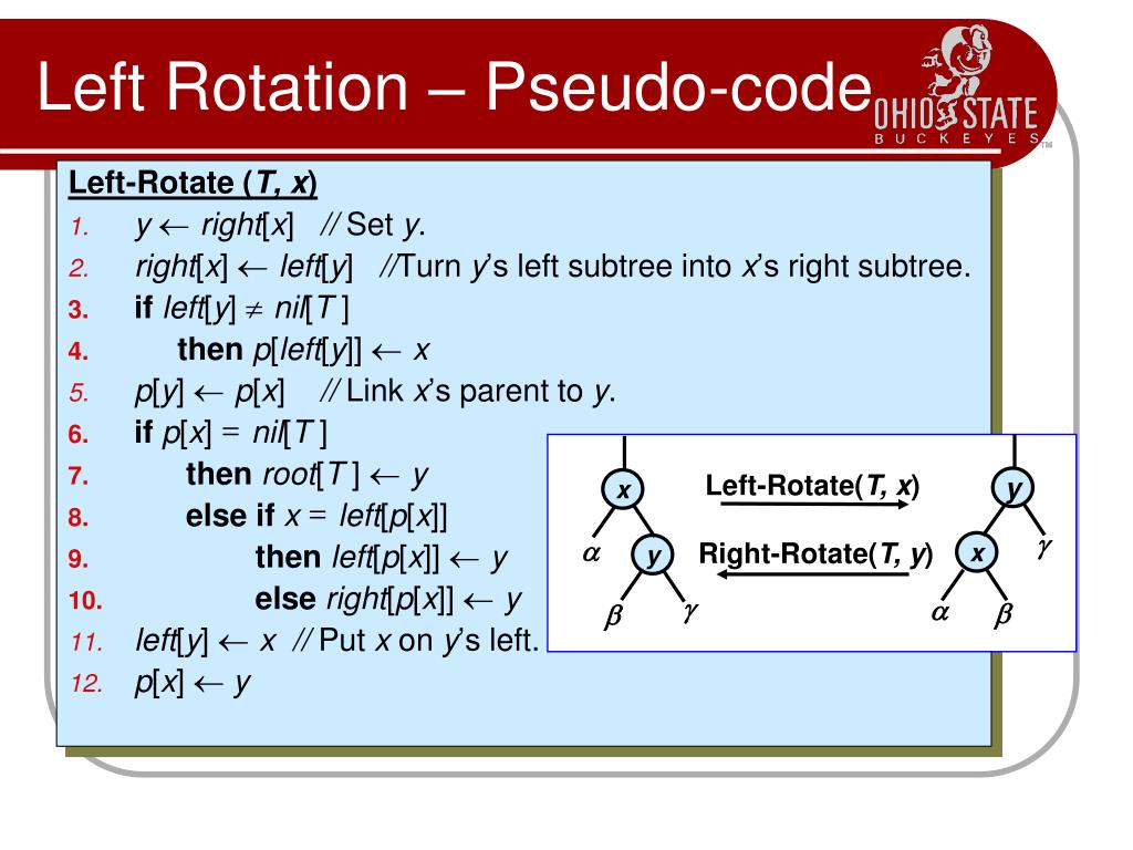 Rotation • The pseudo-code for Left-Rotate assumes that • right[x] nil[T ], and • root’s parent is nil[T ]. • Left Rotation on x, makes x the left child of y, and the left subtree of y into the right subtree of x. • Pseudocode for Right-Rotate is symmetric: exchange left and right everywhere. • Time:O(1)for both Left-Rotate and Right-Rotate, since a constant number of pointers are modified.