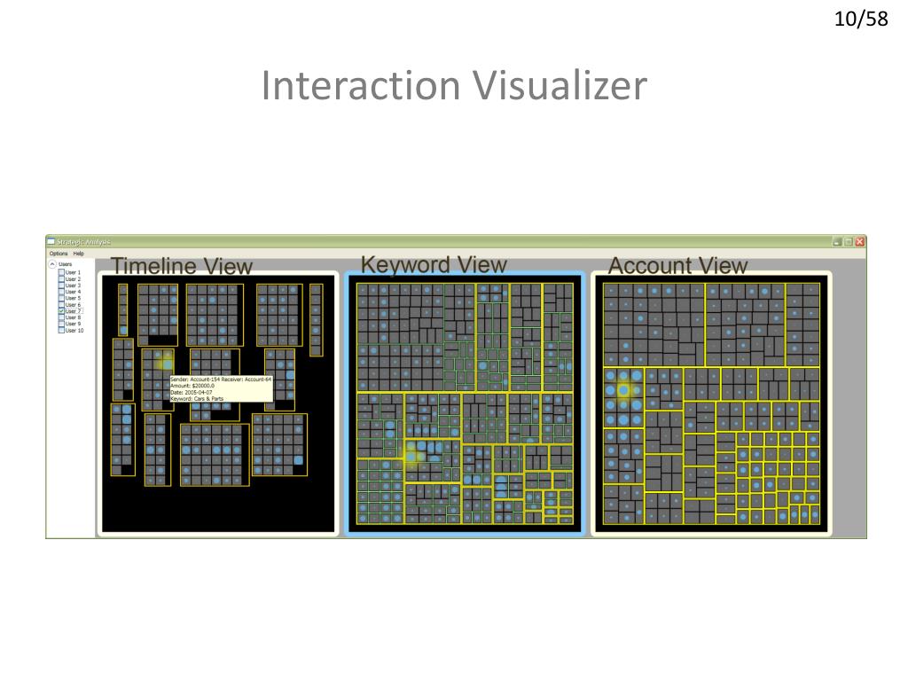 What’s in a User’s Interactions • From this experiment, we find that interactions contains at least: • 60% of the (high level) strategies • 60% of the (mid level) methods • 79% of the (low level) findings R. Chang et al., Recovering Reasoning Process From User Interactions. IEEE Computer Graphics and Applications, 2009. R. Chang et al., Evaluating the Relationship Between User Interaction and Financial Visual Analysis. IEEE Symposium on VAST, 2009.