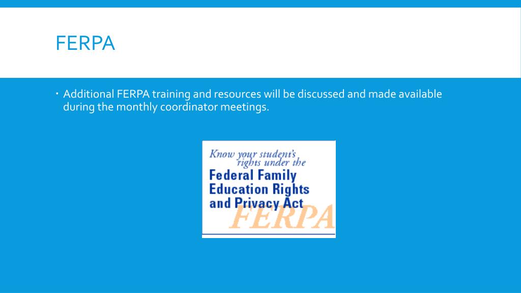 FERPA • Additional FERPA training and resources will be discussed and made available during the monthly coordinator meetings.