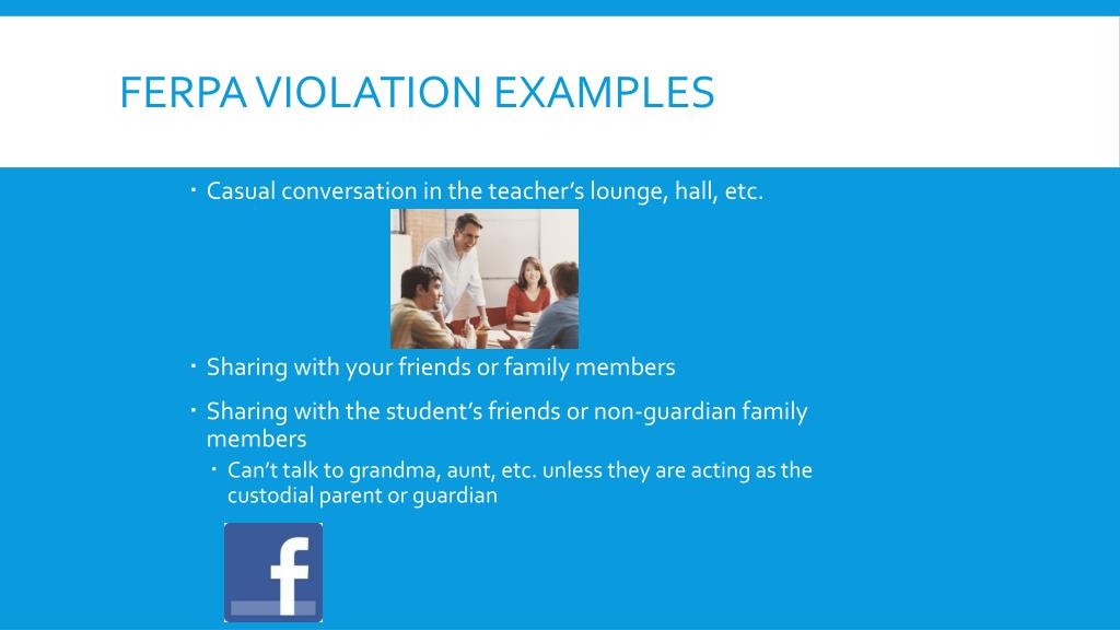 FERPA violation Examples • Casual conversation in the teacher’s lounge, hall, etc. • Sharing with your friends or family members • Sharing with the student’s friends or non-guardian family members • Can’t talk to grandma, aunt, etc. unless they are acting as the custodial parent or guardian