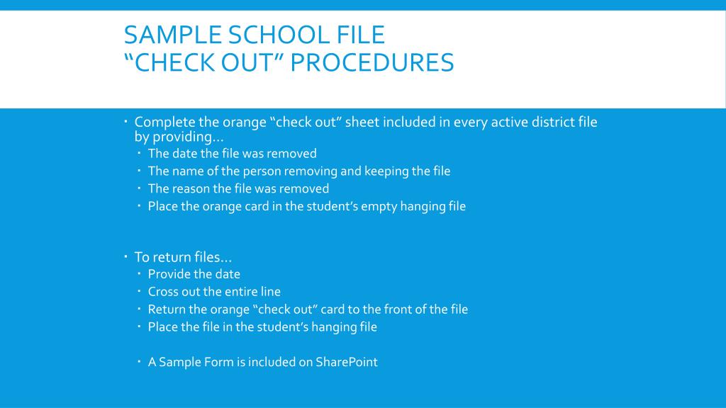 Sample School File “Check out” Procedures • Complete the orange “check out” sheet included in every active district file by providing… • The date the file was removed • The name of the person removing and keeping the file • The reason the file was removed • Place the orange card in the student’s empty hanging file • To return files… • Provide the date • Cross out the entire line • Return the orange “check out” card to the front of the file • Place the file in the student’s hanging file • A Sample Form is included on SharePoint