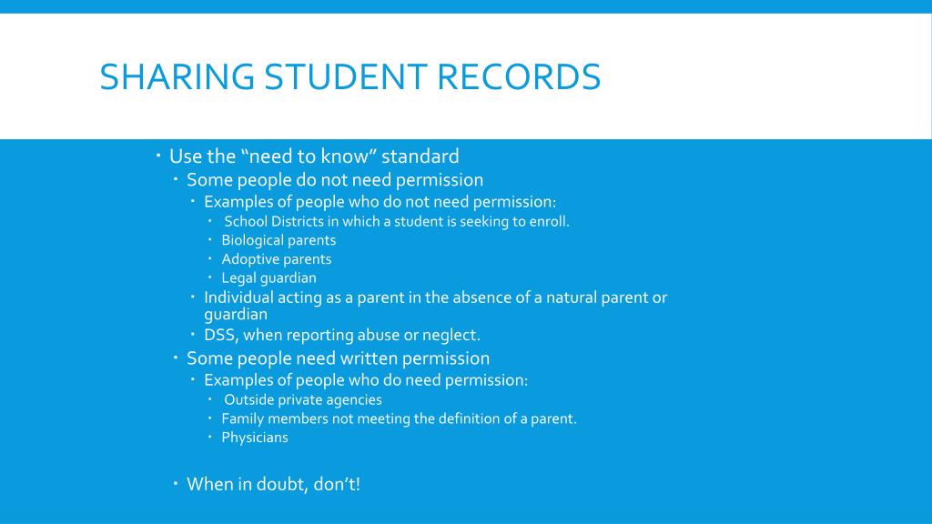 Sharing Student Records • Use the “need to know” standard • Some people do not need permission • Examples of people who do not need permission: • School Districts in which a student is seeking to enroll. • Biological parents • Adoptive parents • Legal guardian • Individual acting as a parent in the absence of a natural parent or guardian • DSS, when reporting abuse or neglect. • Some people need written permission • Examples of people who do need permission: • Outside private agencies • Family members not meeting the definition of a parent. • Physicians • When in doubt, don’t!