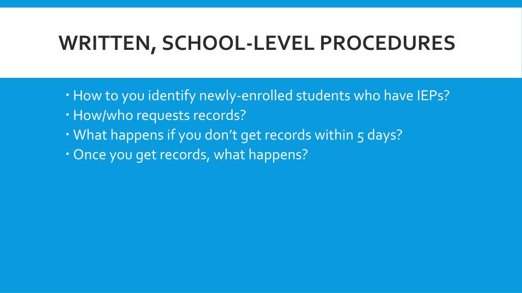 Written, school-level procedures • How to you identify newly-enrolled students who have IEPs? • How/who requests records? • What happens if you don’t get records within 5 days? • Once you get records, what happens?