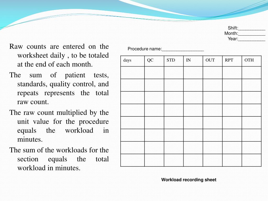 Shift:___________ Month:___________ Year:___________ Procedure name:_________________ Raw counts are entered on the worksheet daily , to be totaled at the end of each month. The sum of patient tests, standards, quality control, and repeats represents the total raw count. The raw count multiplied by the unit value for the procedure equals the workload in minutes. The sum of the workloads for the section equals the total workload in minutes. Workload recording sheet