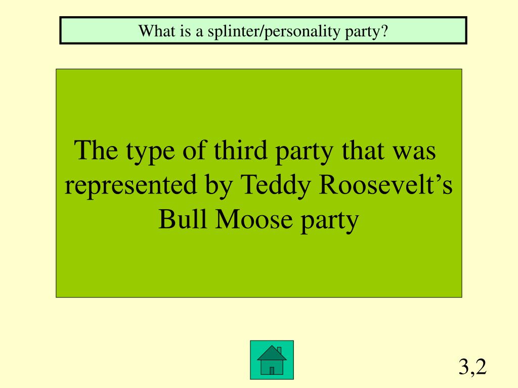 3,2 What is a splinter/personality party? The type of third party that was represented by Teddy Roosevelt’s Bull Moose party
