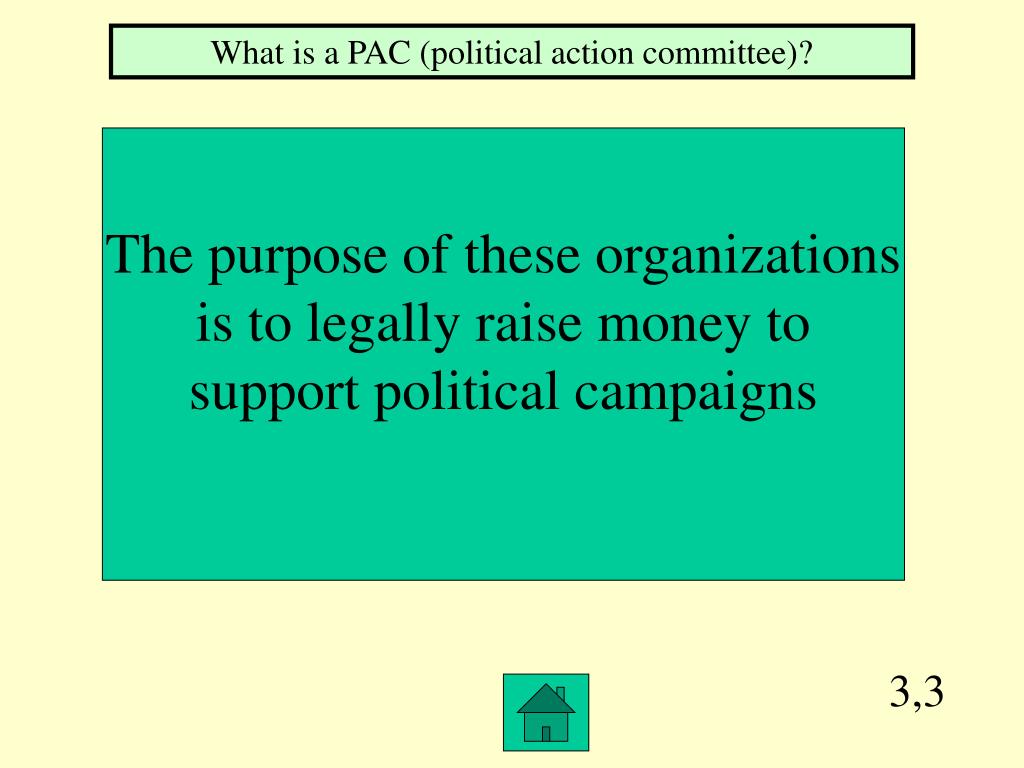 3,3 What is a PAC (political action committee)? The purpose of these organizations is to legally raise money to support political campaigns