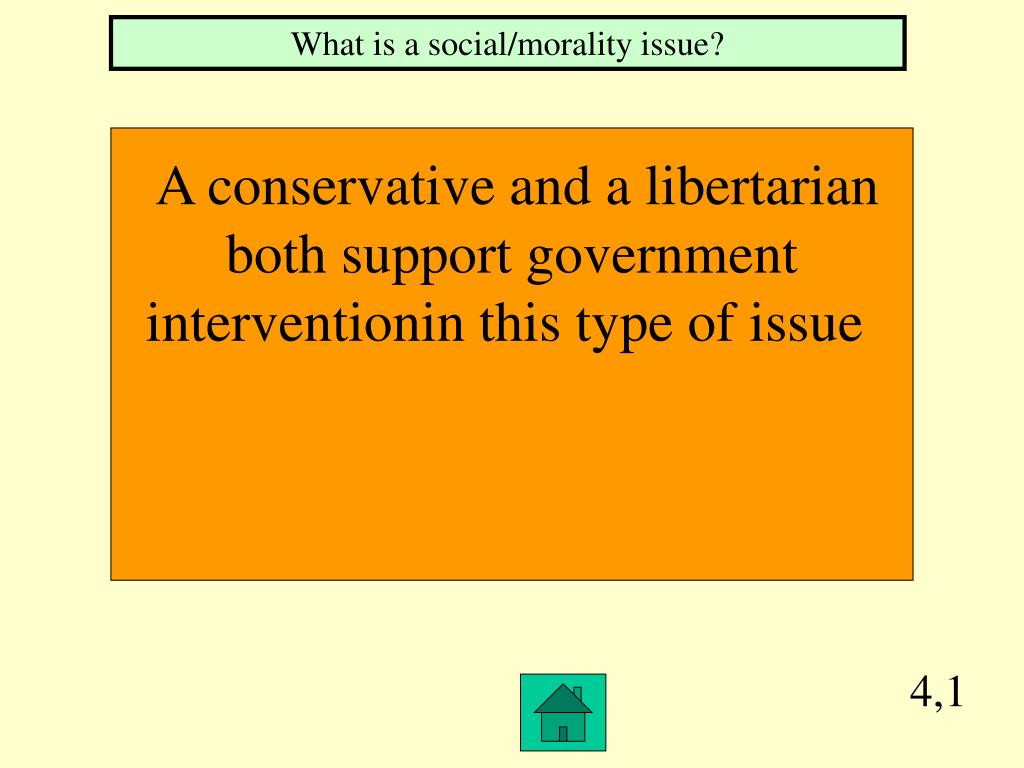 4,1 What is a social/morality issue? A conservative and a libertarian both support government interventionin this type of issue