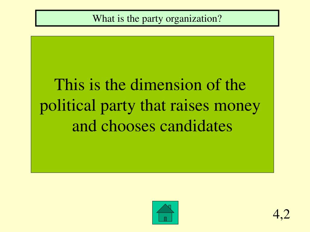 4,2 What is the party organization? This is the dimension of the political party that raises money and chooses candidates