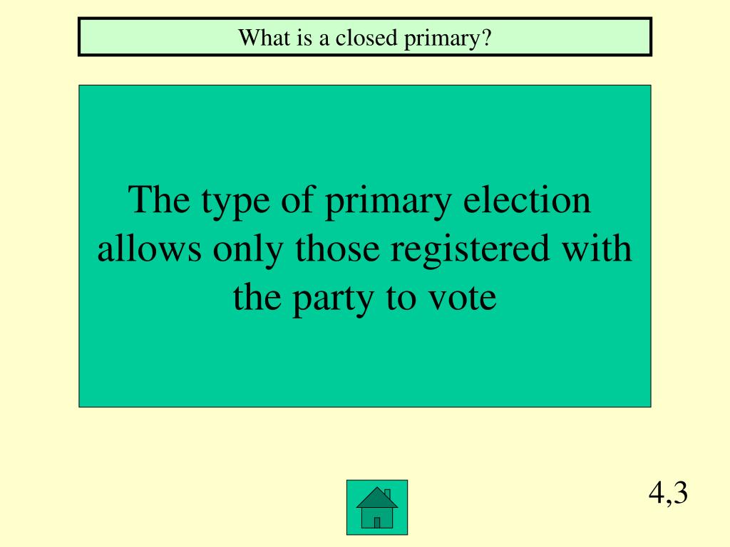 4,3 What is a closed primary? The type of primary election allows only those registered with the party to vote