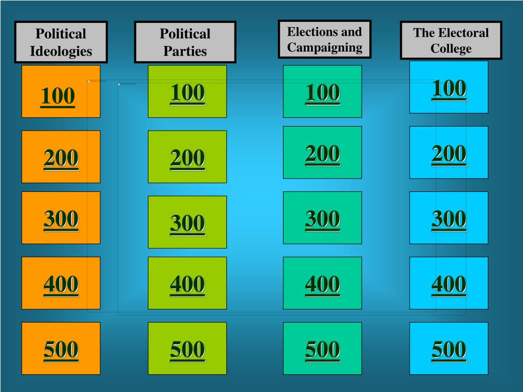 Elections and Campaigning Political Ideologies Political Parties The Electoral College 100 100 100 100 200 200 200 200 300 300 300 300 400 400 400 400 500 500 500 500