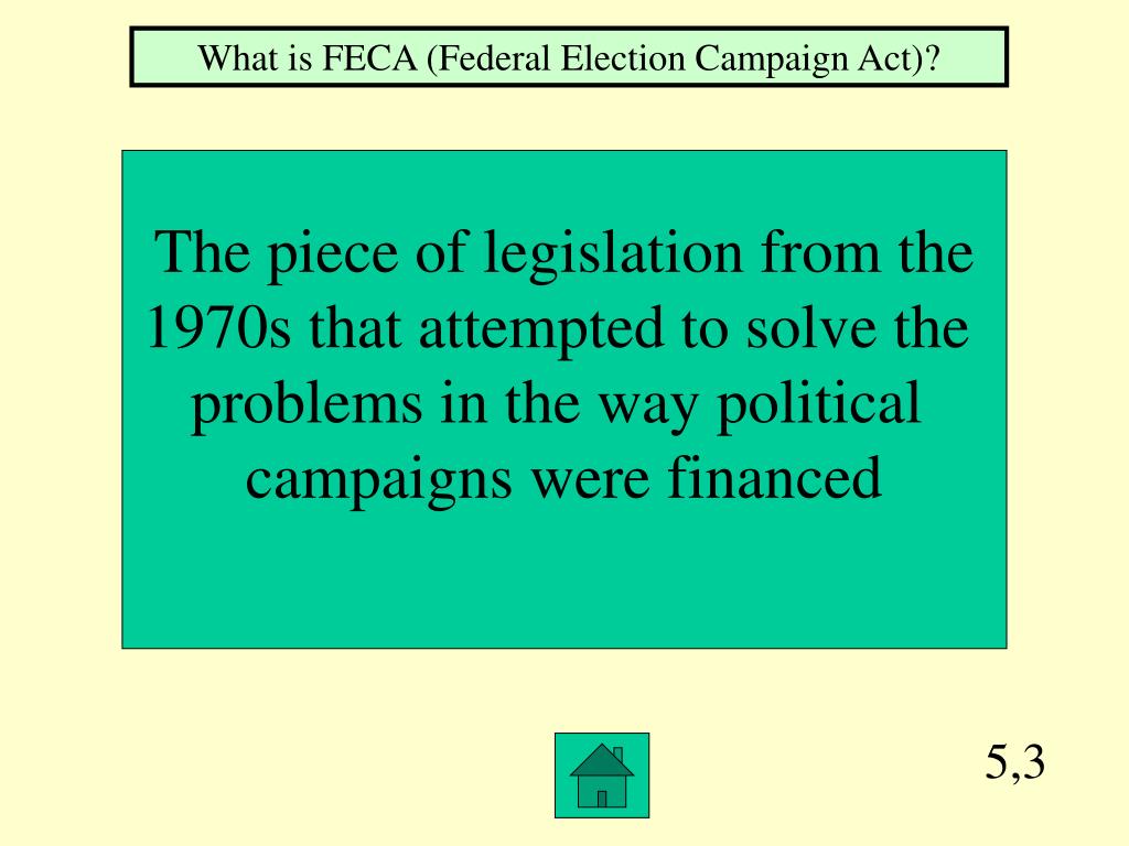 5,3 What is FECA (Federal Election Campaign Act)? The piece of legislation from the 1970s that attempted to solve the problems in the way political campaigns were financed