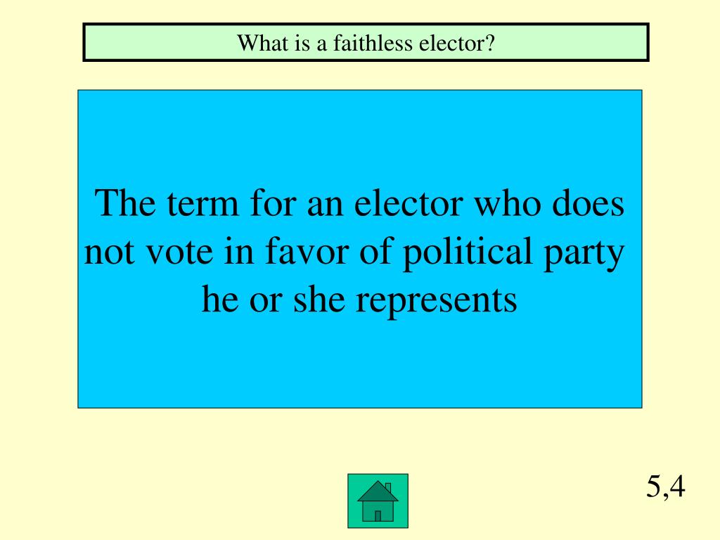 5,4 What is a faithless elector? The term for an elector who does not vote in favor of political party he or she represents