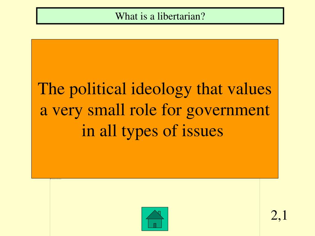 2,1 What is a libertarian? The political ideology that values a very small role for government in all types of issues